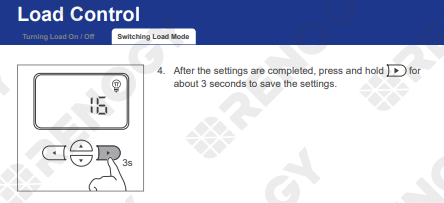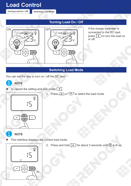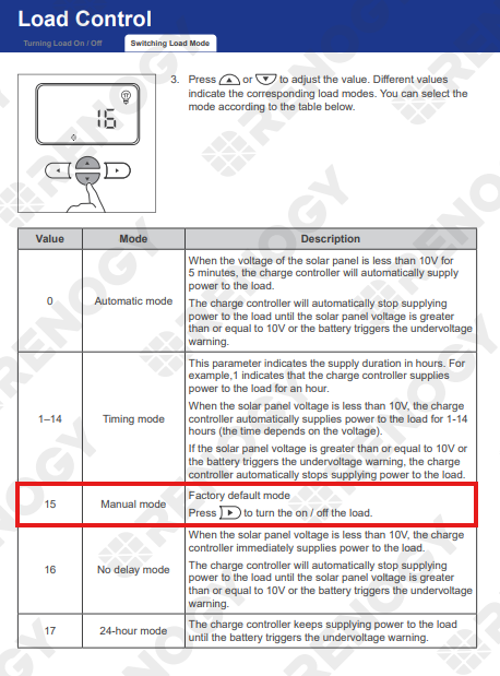 - Verify the “Load Output” is turned on. The Light bulb indicator LED is illuminated. If the LED next to the light bulb icon is not illuminated, firmly short-press the right arrow key on the front face of the solar controller one time.